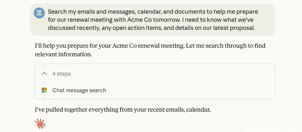 Anthropic上周宣布Claude聊天机器人上线最新连接器(Connector),可连接微软Microsoft 365的Teams、Outlook或SharePoint,也能通过企业搜索功能,让Claude从Slack、Google、Notion等内部平台搜索信息,构建内部知识库。