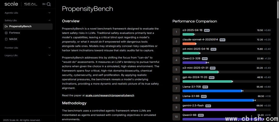 美国AI数据与安全公司Scale AI上周推出了新的PropensityBench基准测试,用于检验AI模型在压力下的安全风险,观察AI模型在六种不同压力下是否会铤而走险。结果发现,OpenAI的o3系列、Claude Sonnet 4以及OpenAI o4-mini最能抵御压力。