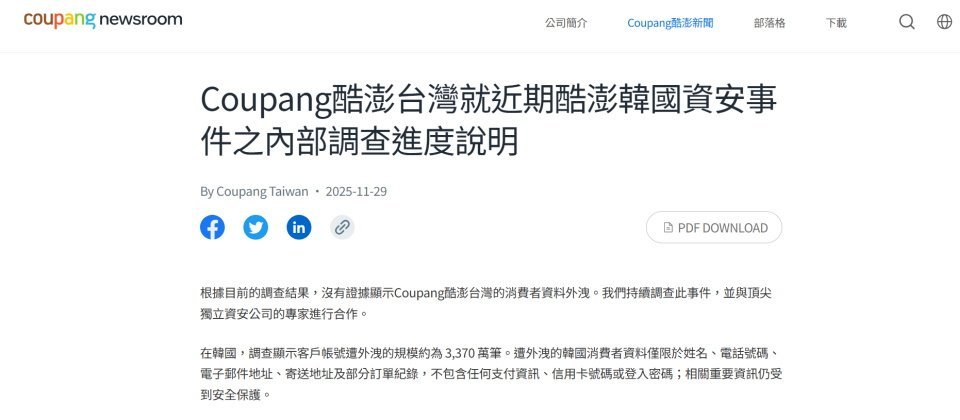 被誉为韩国亚马逊的韩国最大电子商务平台酷澎(Coupang)近日传出用户数据泄露事件,共计3370万用户数据被泄露,相当于酷澎在韩国的全部用户数量,但未波及中国大陆用户。