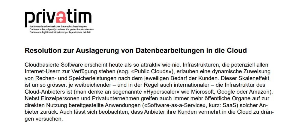 Privatim认为,在大多数情况下,将高度敏感的个人信息及受保密义务约束的数据外包给大型国际供应商的SaaS方案(尤其是Microsoft 365)是不符合要求的。原因之一是大多数SaaS服务尚未提供真正的端到端加密。其次,这些平台的技术运作(例如安全更新发布或软件变更)以及员工及其分包商的管理缺乏透明度,无法满足瑞士对数据保护和信息安全的严格要求,导致瑞士对SaaS服务的管控能力丧失。