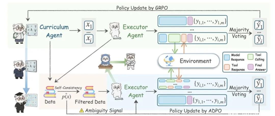 这不是简单的“自我训练”,而是一场由两个AI智能体共同导演的“认知军备竞赛”。系统内部分为两个角色:一个是“课程设计师”——课程智能体,负责不断出题;另一个是“解题者”——执行智能体,负责破解难题。两者没有外部干预,全靠彼此推动。