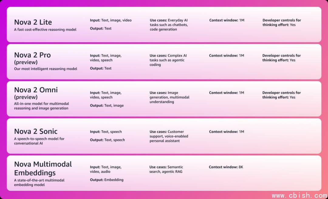 本次发布的Nova 2系列包含四款针对性极强的模型,满足从轻量级内容生成到复杂多模态推理的多样化企业需求: