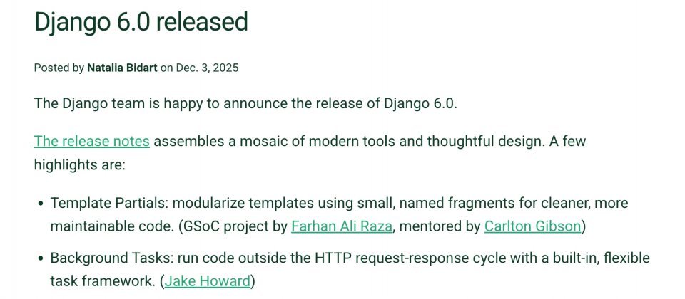 Python的Web开发框架Django团队发布新版Django 6.0,该主要版本对框架核心进行调整,在保持既有开发模式的前提下,引入后台任务框架与内容安全策略(Content Security Policy,CSP)支持,同时更新Python兼容版本与旧版维护周期。