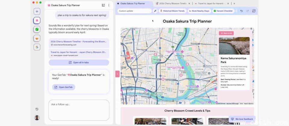 GenTabs能将用户打开的多个网页标签页,转化为一个交互式应用。用户只需在浏览器左侧边栏的AI聊天机器人中输入自然语言提示,例如“想去某个地方旅游”“想看哪些景点”等,并逐个点击搜索结果中的网页链接。GenTabs底层的Gemini会分析用户的对话记录和已打开的标签页,主动征求用户的意见进行调整,最终生成一个交互式网页应用,例如包含旅游景点地图、天气、日期等信息的Web应用。用户无需编写任何代码,仅通过自然语言描述需求即可。所有生成的元素都会链接回原始来源。