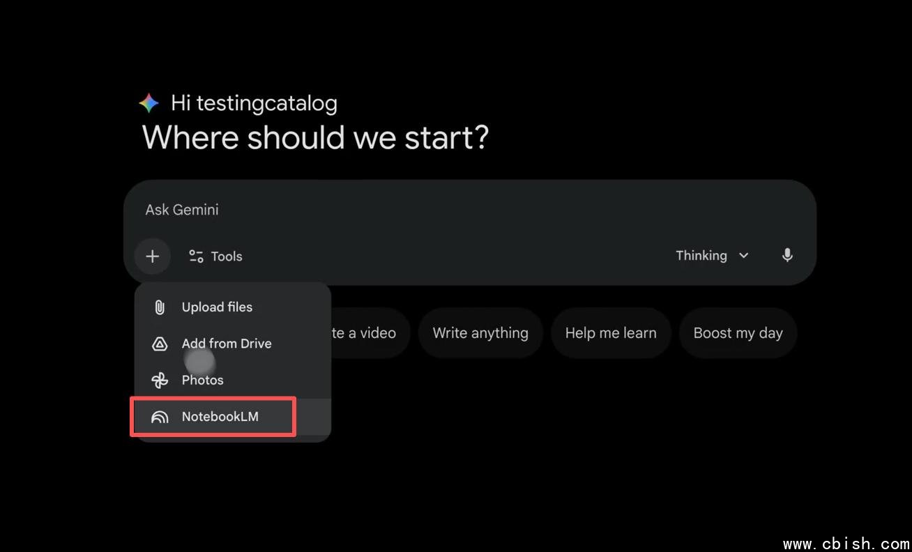 已经有用户在 Gemini 的对话界面中,发现了一个熟悉的入口——“NotebookLM”出现在“+”添加菜单里,和“上传文件”“从 Drive 添加”并列。这意味着什么?