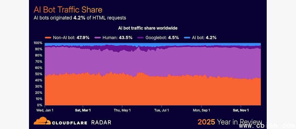 自2024年起,全球网络上的机器人流量已超过人类流量。在2025年的网络流量中,47.9%来自机器人,包括搜索引擎、SEO工具、监控服务、广告/分析系统及自动化程序等;人类流量占43.5%;Googlebot占4.5%;各类AI爬虫占4.2%。