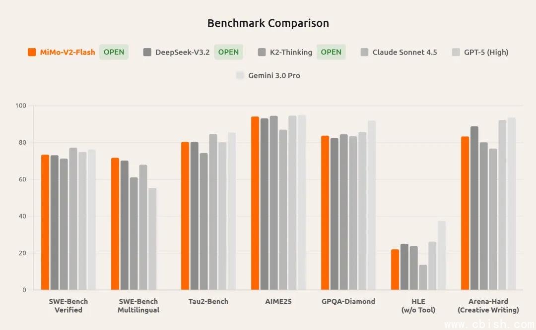 在权威基准测试中,MiMo-V2-Flash的表现远超预期: