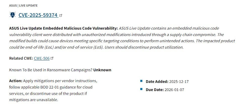 该漏洞为Asus Live Update工具中的嵌入式恶意代码漏洞,CVSS评分为9.3。CISA指出,该工具客户端曾遭到供应链攻击,被非法篡改。被篡改的软件可能导致满足特定条件的设备执行非预期行为。CISA敦促所有联邦行政部门必须在2026年1月7日前修复或停用受影响软件。