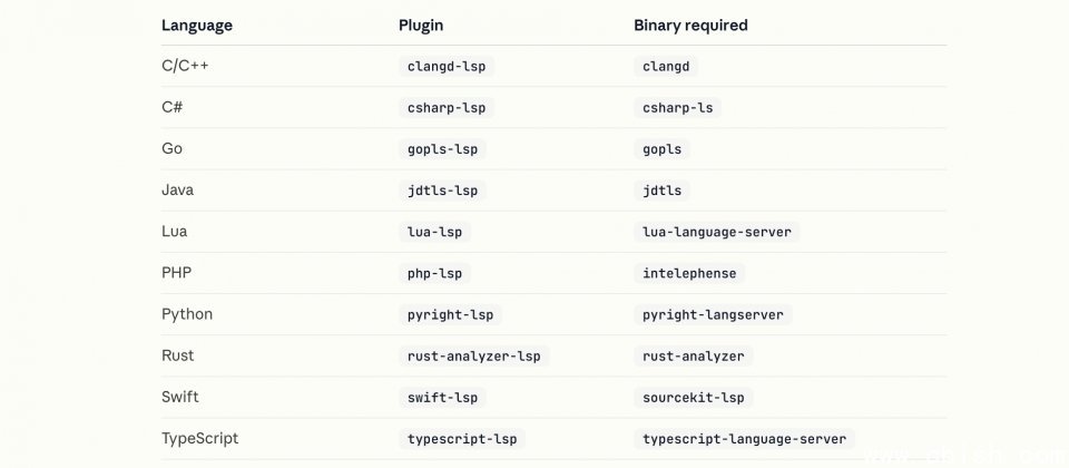 官方文档指出,LSP 服务器配置可放在插件根目录的 .lsp.json 文件中,或直接写入 plugin.json 中,并通过文件扩展名对应语言标识。插件仅描述如何启动语言服务器,语言服务器的可执行文件仍需单独安装。若系统找不到可执行文件,将在 /plugin 错误页面提示相关信息。官方还列出了多种常见语言的代码智能插件及其所需的语言服务器,并说明用户可在 /plugin 的“发现”标签页中搜索 “lsp” 进行安装。