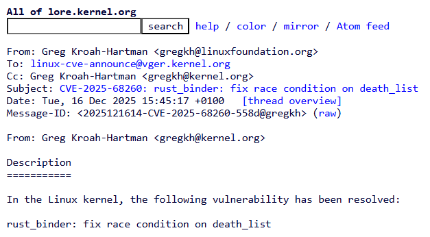 Linux内核CVE团队指出,该漏洞是在Linux内核6.18版本中引入的,源自一次更新Binder代码的提交,但当时未妥善处理同步机制。相关问题已在后续版本中修复,包括Linux内核6.18.1与6.19-rc1。