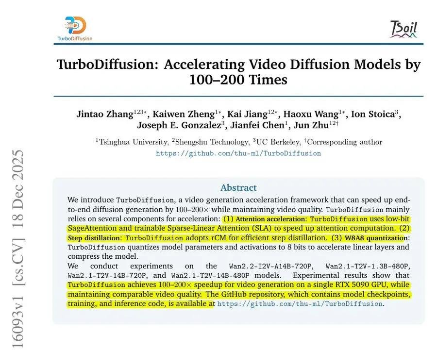 近日,字节跳动与清华大学联合发布了一项颠覆性视频生成技术——TurboDiffusion,并同步开源了 GitHub 项目与完整论文。这项技术直击当前AI视频生成领域的“卡脖子”难题:生成慢、算力贵、难落地。以往,一个14B参数的视频扩散模型生成一段720P视频,动辄需要数小时;而TurboDiffusion将这一时间压缩至24秒,提速近200倍,首次让高质量视频生成真正具备了“实时交互”的可能。