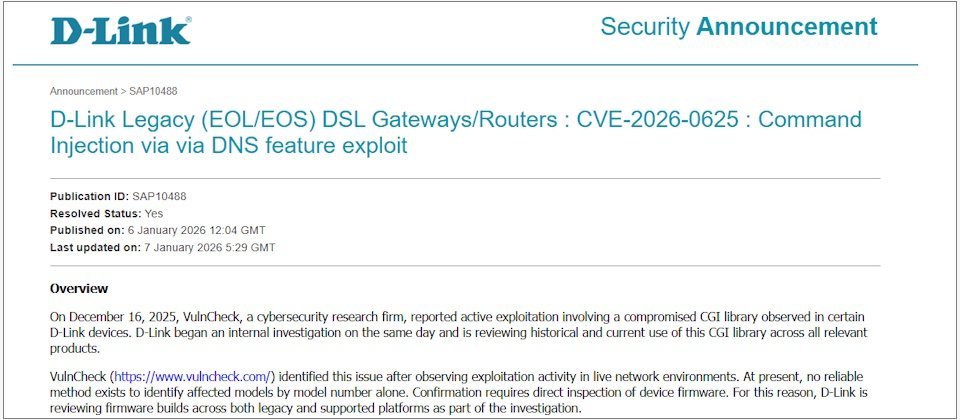 友讯科技(D-Link)多款已到产品生命周期终止(EoL)的DSL路由器被发现存在高风险命令注入漏洞,相关攻击行为已在蜜罐环境中被观测到。该漏洞编号为CVE-2026-0625,CVSS风险评分高达9.3,属于高危等级。
