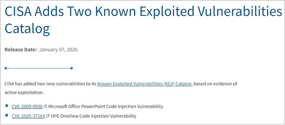 这两个新加入KEV目录的漏洞分别为CVE-2009-0556和CVE-2025-37164。