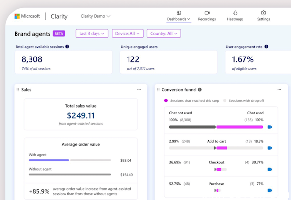 目前Brand Agents仅开放给Shopify商家使用,需先在官网安装免费行为分析工具Microsoft Clarity,并于Clarity后台申请启用,通过后即可在无需额外整合的情况下,将AI导购功能部署到品牌网站上。