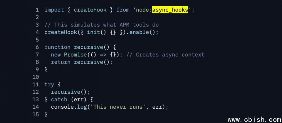 Node.js 安全公告指出,当启用 async_hooks 相关追踪机制时,若发生调用栈耗尽,错误可能无法进入常规异常处理流程,甚至连 uncaughtException 这类未捕获异常事件也可能不会触发,导致程序直接崩溃。如果应用程序存在由外部输入驱动递归深度的逻辑,例如处理高度嵌套的 JSON 数据,就可能被单个请求触发栈溢出,致使服务整体中断或反复重启。
