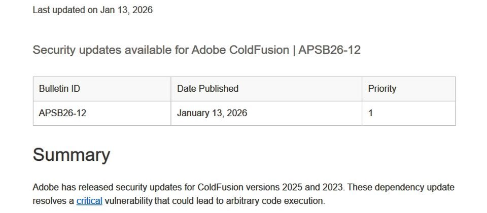 1月13日,Adobe针对旗下13款应用程序发布更新,共修复25个漏洞,其中18个被列为重大级别,相比12月公布的139个漏洞,数量大幅下降。值得关注的是,本次最危险且受到高度关注的漏洞出现在网页应用开发平台ColdFusion的CVE-2025-66516。Adobe呼吁企业优先部署ColdFusion的更新。