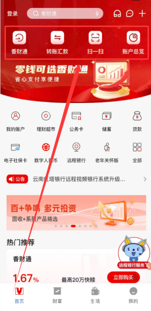 3、登录后,首页直观展示“香财通”特色服务、常用转账入口、扫码支付工具及个人资产总览,让您一目了然掌握资金动态,快速触达高频功能。