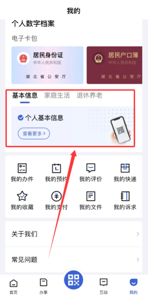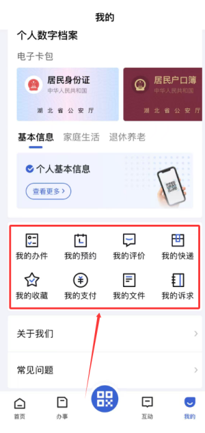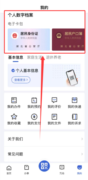 1、进入“我的”个人中心,点击【电子卡包】功能,可集中管理医保电子凭证、身份证、社保卡、会员卡及各类优惠券等数字证照,实现“一码通办”。