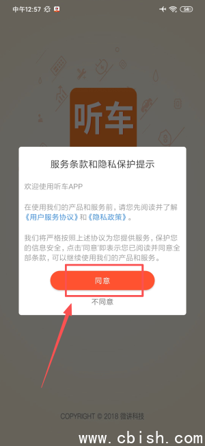 1、首次打开App时,会弹出服务条款窗口,请点击“同意”以继续使用。