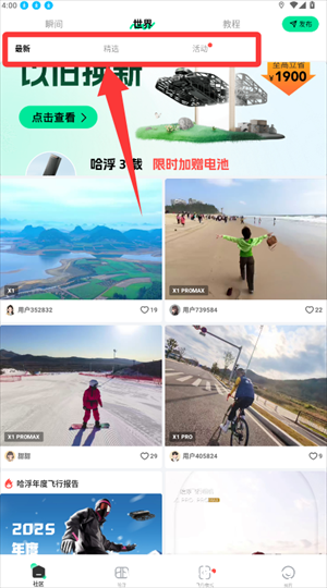 2、在社区顶部点击不同分类标签(如“热门”“最新”“风景”“城市”等),快速筛选感兴趣的内容板块,浏览其他用户上传的精彩航拍作品。