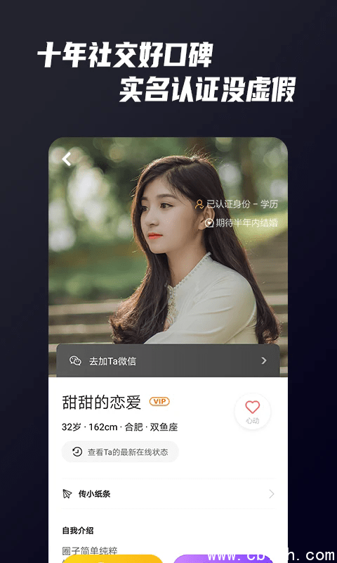 平台运营超十年,累计服务数千万用户,建立行业领先的“五重真实性审核机制”:身份证认证、人脸比对、学历核验、职业背调、行为风控,杜绝酒托、婚托、广告营销号。