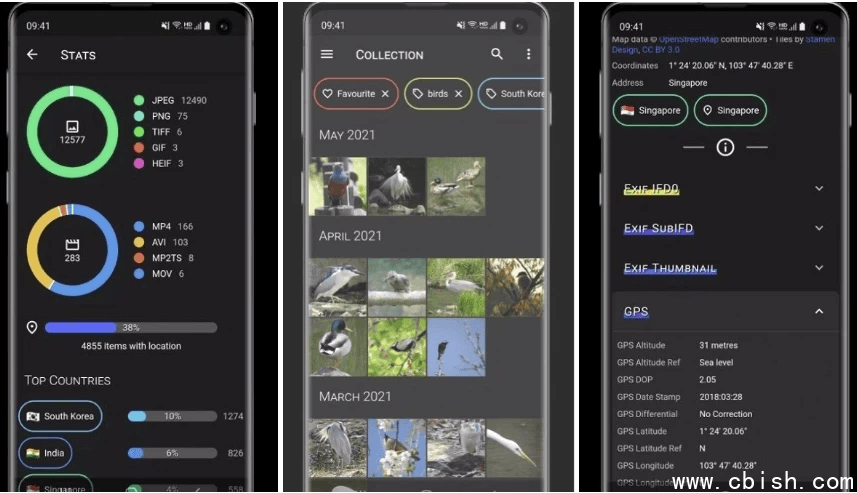 它对动态内容的支持也远超普通相册:GIF、WebP、APNG 动图流畅播放;360° 全景图可直接在应用内拖拽浏览;支持 HDR 和 RAW 格式原图预览,摄影师和摄影爱好者也能用得顺手。更特别的是,它能读取并清晰展示 EXIF 数据——拍摄时间、光圈、快门、GPS 坐标、设备型号一目了然,帮你找回那些被遗忘的旅行瞬间。