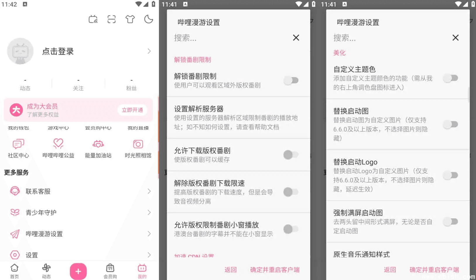 3. 安装后打开App,点击「关于版本」连续点击5次 → 重启 → 进入「哔哩漫游」设置 → 下拉开启你想要的功能。
