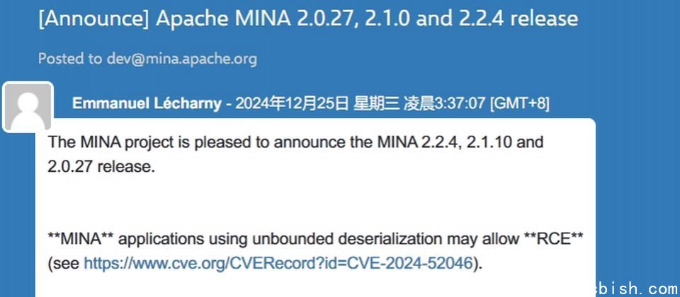 12月25日Apache基金会发布Java网路应用程序框架Apache MINA更新2.2.4、2.1.10、2.0.27版,主要是为了修补远端程序码执行(RCE)漏洞CVE-2024-52046,这项漏洞影响2.0.0至2.2.3版,CVSS风险评分达到10分(满分10分),相当危险。