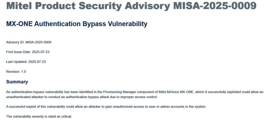加拿大电信业者Mitel发布资安公告,指出企业通讯平台MX-ONE存在重大层级的身分验证绕过资安漏洞,影响7.3至7.8 SP1版,CVSS风险达到9.4,该公司也已针对此漏洞发布修补程序,呼吁用户要儘速採取行动因应。