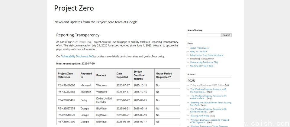新的通报透明度政策下,Google计画在通报原厂漏洞约1星期后,Project Zero就会公布部份漏洞资料。这些资讯包括接获漏洞报告的厂商或开源专案、影响的产品、报告成立的日期,以及90天揭露期的大限日期。