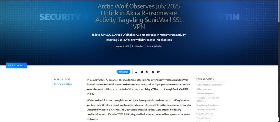 7月中旬Google威胁情报团队(GTIG)揭露锁定SonicWall SSL VPN设备的攻击行动,骇客企图部署恶意软件Overstep,后续骇客组织World Leaks声称骇入电脑大厂Dell内部的产品展示及测试的环境,传出入侵的管道,很可能就是上述的SSL VPN设备。如今资安业者Arctic Wolf指出,勒索软件Akira也加入攻击该厂牌的SSL VPN系统的行列。