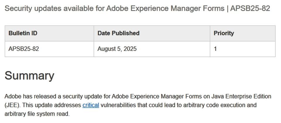 这两个漏洞是CVE-2025-54253、CVE-2025-54254,影响6.5.23之前版本的AEM Forms,其中最严重的是CVSS评分达到10分的CVE-2025-54253,此漏洞起因是组态不当,可被用于执行任意程序码,一旦攻击者成功用,就有机会绕过安全机制并执行程序码,而且,过程里完全无需使用者互动。