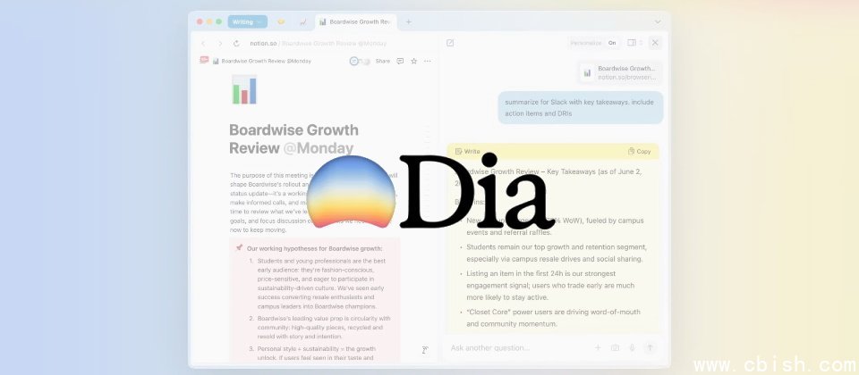 Dia同样採用Chromium架构,但在右边侧栏直接嵌入AI助手,使用者可直接在侧栏与AI对话,或是与已开启的分页内容互动,请它摘录内容,提供写作建议或是协助购物等,或是整合不同分页的资讯;它也具备某些AI技能,可根据使用情境呼叫不同的AI模型执行特定任务。