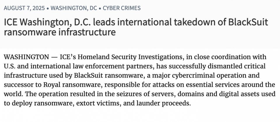 美国国土安全调查局(Homeland Security Investigations,HSI)华盛顿特区办事处宣布,联合美国多个执法单位与国际伙伴,成功拆解BlackSuit勒索软件的关键基础设施。BlackSuit被视为Royal勒索软件的继任者,自2022年起两者合计已在美国锁定超过450家已知受害机构,涵盖医疗、教育、公共安全、能源与政府部门,勒索金额估算约达3.7亿美元。此次行动查扣服务器、网域与数位资产,并关闭攻击者用来部署勒索软件、勒索受害者与洗钱的基础设施。