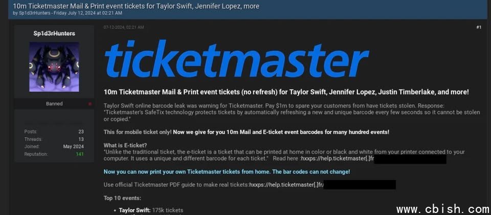 ReliaQuest也引述资安部落格DataBreaches.Net揭露的内容,在Telegram上使用Sp1d3rhunters为ID的人士宣称,两个骇客组织其实是相同的。ReliaQuest循线在BreachForums找到同名使用者,此人于2024年7月在骇客论坛洩露一批与Ticketmaster资料外洩事故有关的文件,而这起事故当时大家认为就是ShinyHunters所为,所以Scattered Spider当然也牵涉其中。