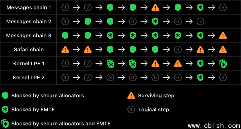 MIE的基础来自苹果近年推行的类型安全分配器(Allocator),包括核心的kalloc_type、用户层的xzone malloc,以及WebKit的libpas。这些分配器会根据类型信息决定内存配置方式,降低攻击者通过精准控制配置位置来制造漏洞利用的机会。不过,分配器在页面层级能提供的保护仍有限,因此该公司进一步引入Enhanced Memory Tagging Extension(EMTE),通过标签检查将防护细化到单一配置的层次。