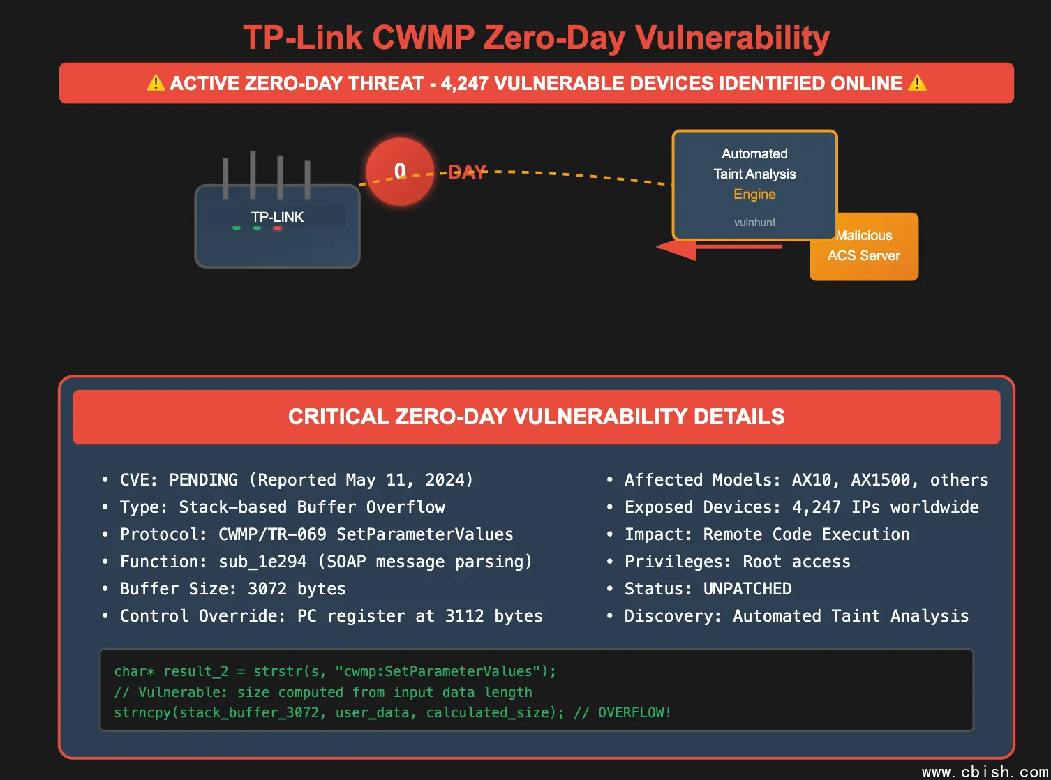 安全公司ByteRay技术长Mehrun Parchebafieh发文揭露,TP-Link在其路由器的CWMP/TR-069通信协议实现中,存在堆栈式缓冲区溢出漏洞CVE-2025-9961,影响包括Archer AX10与AX1500等机型。研究人员通过自动化污点分析工具发现漏洞,于5月11日通报TP-Link,并在9月1日公开漏洞细节,而TP-Link则在9月5日释出完整修补程序。