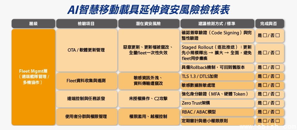 在Fleet Mgmt层(远程车队管理/多机协同)方面,由于此类系统可同时控制大量机器人,一旦遭黑客入侵,后果不堪设想。《安全检核表2》要求验证远程控制与任务分发的权限管理体系,防范C2攻击(Command and Control,命令与控制)。
