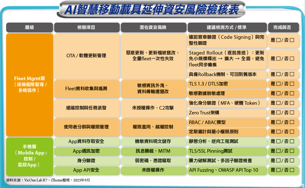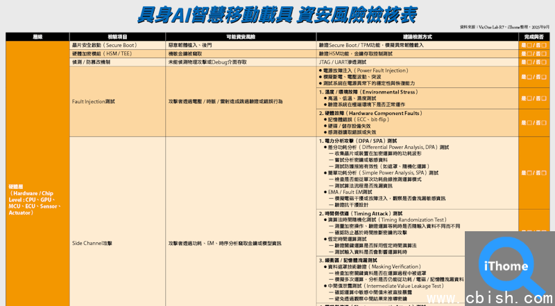 针对具身AI智能移动载具本身的安全,VicOne LAB R7实验室发布的《安全检核表》已涵盖从最底层的硬件芯片到最上层AI模型的数十项严格检查。