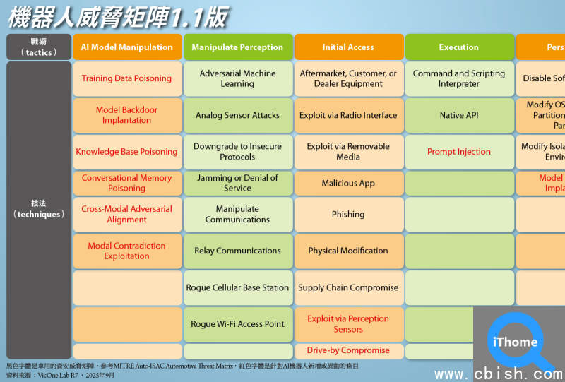 RTM框架的设计参考了汽车威胁矩阵(Auto-ISAC Automotive Threat Matrix,ATM),在原有汽车攻击手法的基础上,增加与修改适用于AI机器人的攻击点。骆一奇表示,这些新增内容反映了机器人在具备AI功能后可能面临的具体安全风险与更广泛的攻击面向。