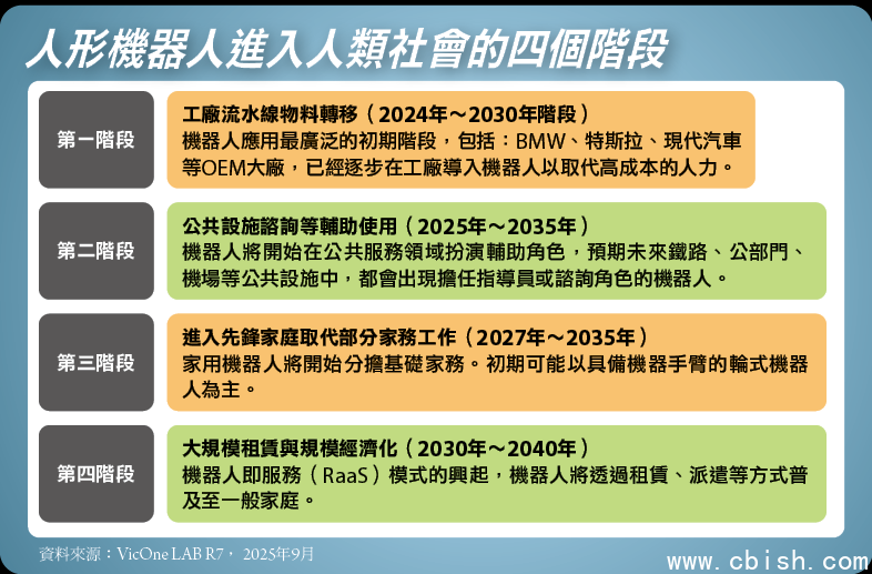 根据VicOne的研究,人形机器人将分成四个阶段进入人类社会,他们也预测了人形机器人部署蓝图:「人形机器人会以工厂部署、公共服务、初阶家务、租赁与进阶家务的阶段进入人类社会」。
