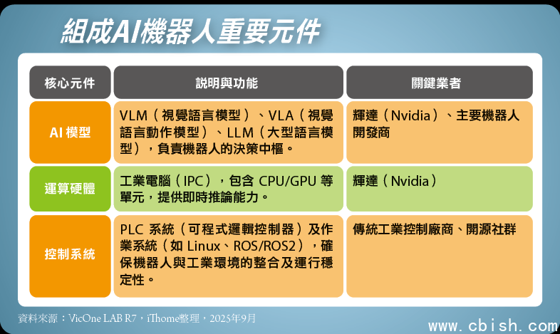 具身AI机器人的核心竞争力在于其「大脑」系统。这套系统赋予机器人感知、推理并采取行动的能力,是实现「物理AI」的关键。目前,具身AI的完整架构包括:AI模型(VLM/VLA/LLM)、工业电脑(IPC,如CPU/GPU)、PLC系统与操作系统(如Linux、ROS/ROS2);其中,AI模型扮演机器人决策的核心角色。