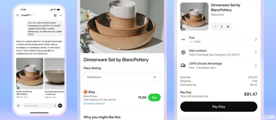 若商品支持即时结账,用户可点击“购买”按钮,并直接在ChatGPT内确认订单、配送及支付信息。目前该功能仅面向美国地区的免费版、ChatGPT Plus及ChatGPT Pro用户开放,且仅支持购买Etsy平台上商家的商品,但很快将扩展至超过100万家使用Shopify系统的商户。其他市场的上线计划尚未公布。