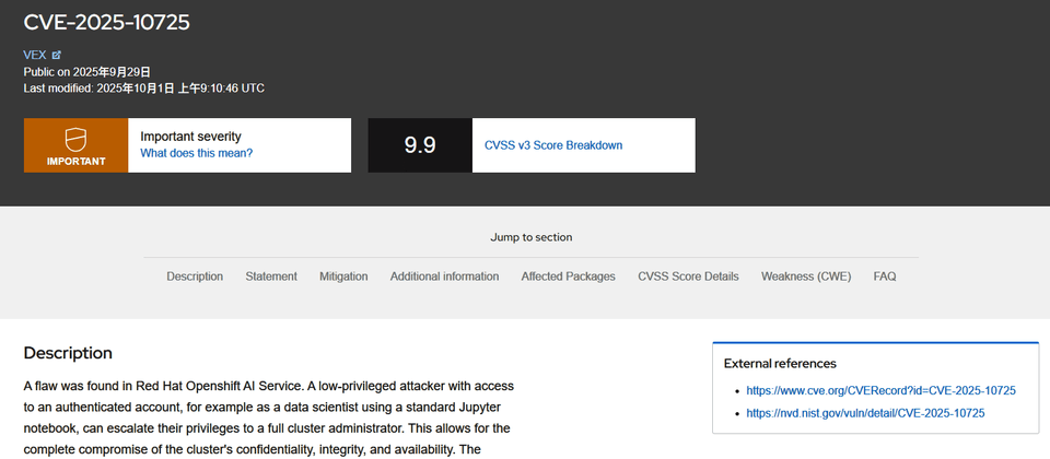 9月29日,Red Hat发布安全公告,为旗下人工智能平台OpenShift AI修复漏洞CVE-2025-10725。该漏洞的CVSS评分为9.9分(满分10分),危险程度极高。若未及时处理,攻击者可能利用此漏洞提升权限,并在特定情况下控制整个基础设施。