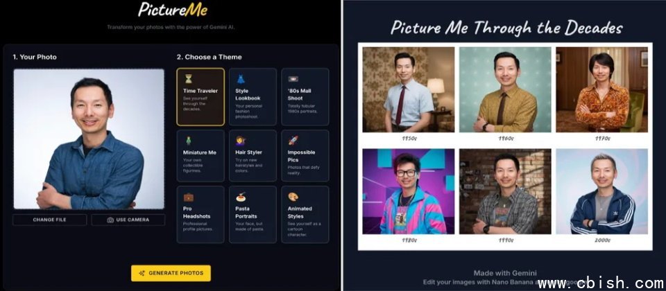 其中值得一提的是,用户或开发者无需编写代码,只需输入一句提示语,即可生成完整的AI图像应用。例如:“帮我创建一个可以上传照片并添加滤镜的图片编辑App”。谷歌团队展示了多个案例,包括PictureMe——用户上传一张照片并选择“80年代商场写真”主题后,系统自动生成6张风格各异的照片;可将静态图转为GIF动画的Bananimate;以及帮助预览不同穿搭效果的Fit Check工具。