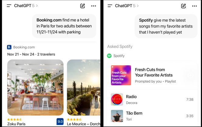 例如可以直接指定Spotify来创建派对歌单,或让Booking.com帮你查找圣诞节期间的巴黎住宿,请求Coursera推荐人工智能入门课程;当与ChatGPT讨论购房问题时,系统会建议调用房产应用Zillow,需要制作演示文稿时,系统则会推荐使用Canva。首次使用各类程序时,ChatGPT会提示连接授权并说明数据共享范围。