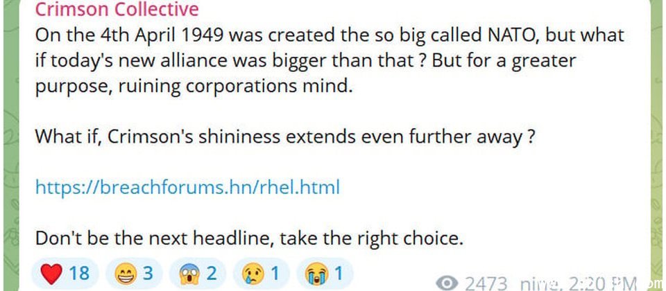 目前,这起事件出现新的进展:黑客正与其他网络犯罪团伙合作,试图向Red Hat施压以索取赎金。据安全新闻网站Bleeping Computer报道,10月5日,Crimson Collective在Telegram频道上宣布,将与黑客组织Scattered Lapsus$ Hunters展开合作,并宣称两者组成的联盟规模甚至超过1949年成立的北约组织(NATO)。