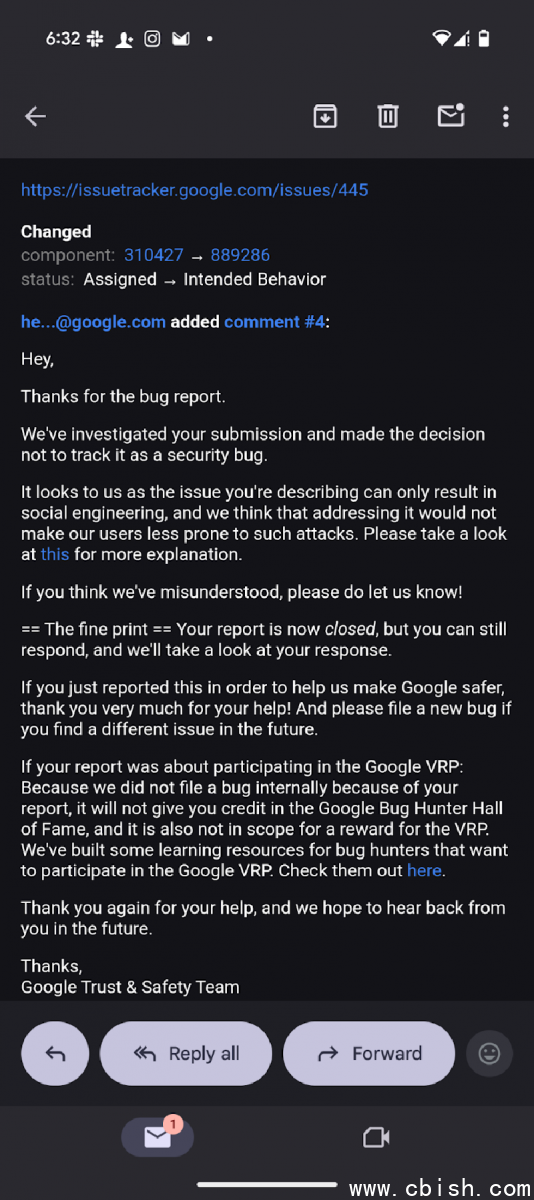 研究人员就研究结果向Google进行通报,获得回复为暂不采取行动。根据Google邮件回复(下图),经内部调查后认为报告内容属于预期行为,而非系统性安全漏洞,该问题主要涉及社交工程情境,并不构成技术层面的安全缺陷,因此不会纳入安全追踪或修补流程。FireTail研究团队其后公开细节,并将此定义为应用层的输入处理问题,呼吁用户加强自身流程的可观测性与审计能力。