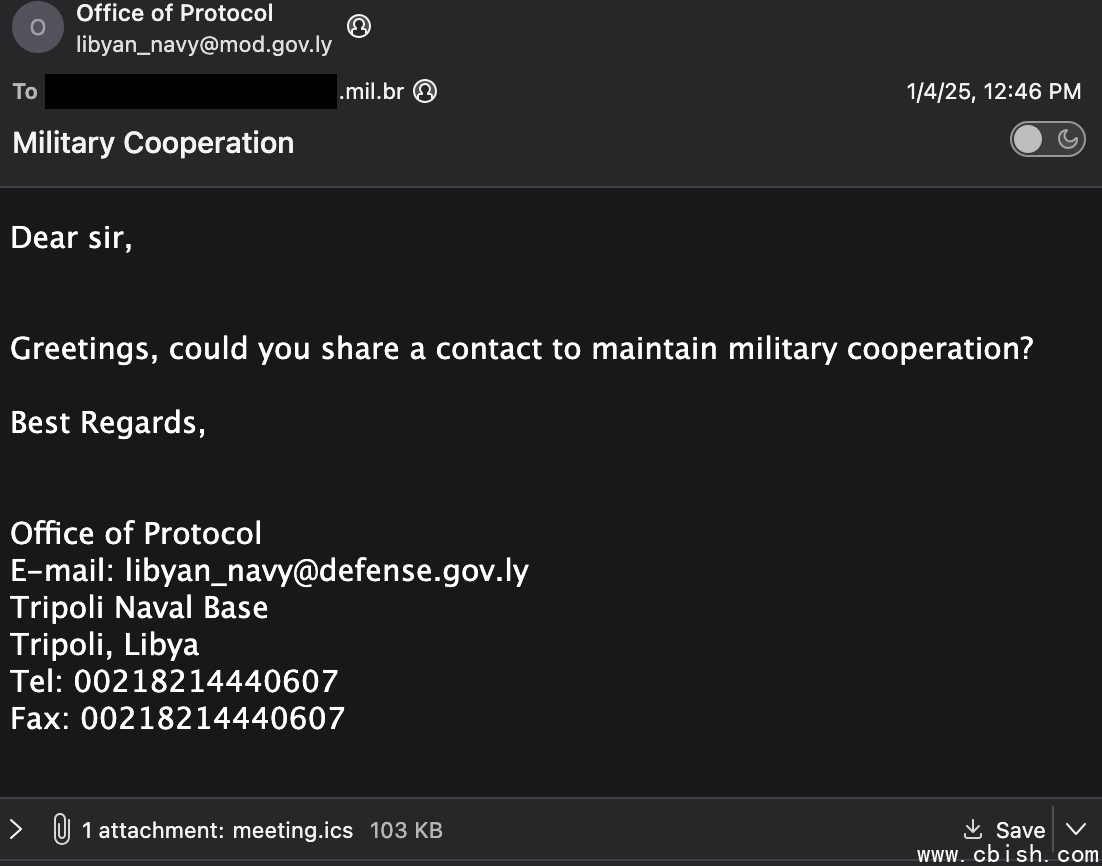 安全企业StrikeReady指出,在1月初有人冒充利比亚海军旗下的礼宾办公室发邮件给巴西军方,夹带恶意的ICS文件,企图利用CVE-2025-27915。由于通过发送电子邮件攻击Zimbra、Roundcube等开源邮件服务器系统的情况并不常见,因而引起StrikeReady注意并展开调查。结果发现,ICS文件内含不寻常、经混淆处理的JavaScript脚本。