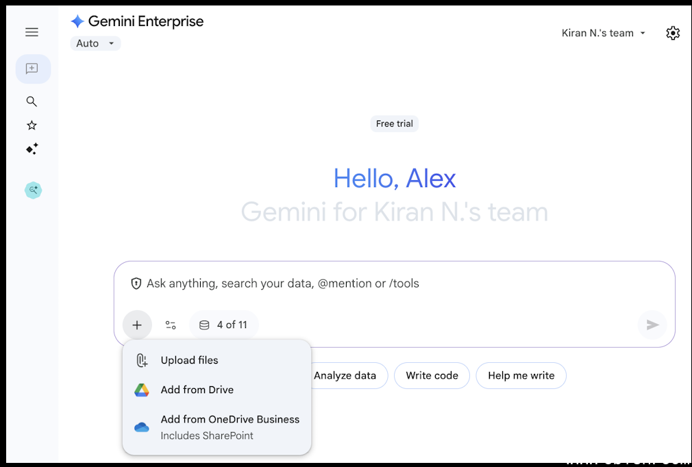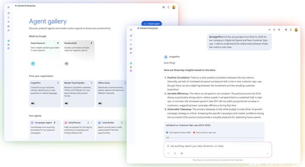 Gemini Enterprise是基于Google Cloud构建的新一代平台服务,但不同于面向Google Workspace的Gemini for Google Workspace Enterprise/Business版本,Gemini Enterprise以Gemini模型和基于Gemini的AI代理为核心,而非以文档、表格、演示文稿等办公应用为主。